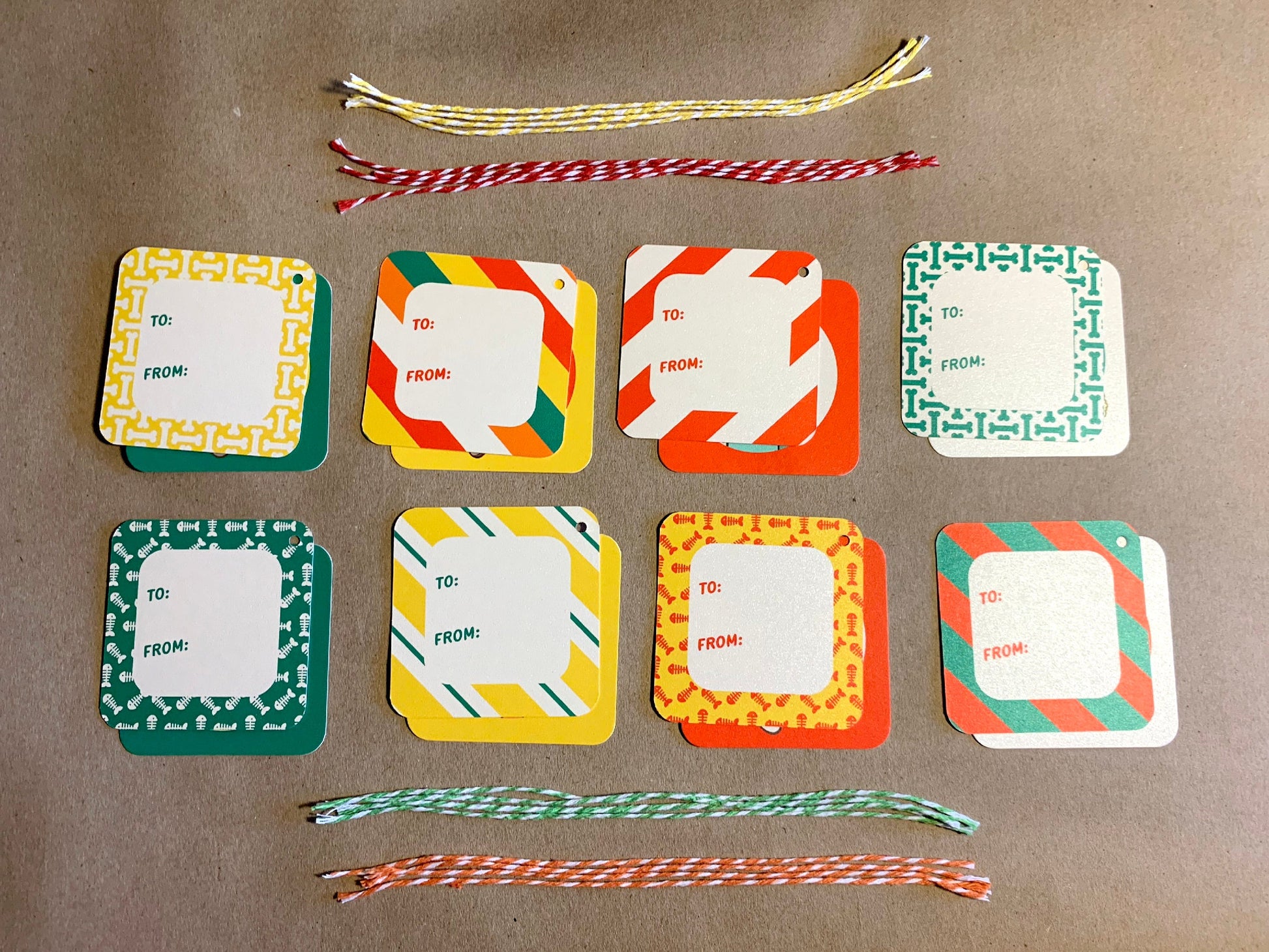• 16 Gift Tags printed digitally on 110# Pearlescent paper Stock (This gives the tags a little sparkle, which will look nice when it picks up little flecks of tree lights.
