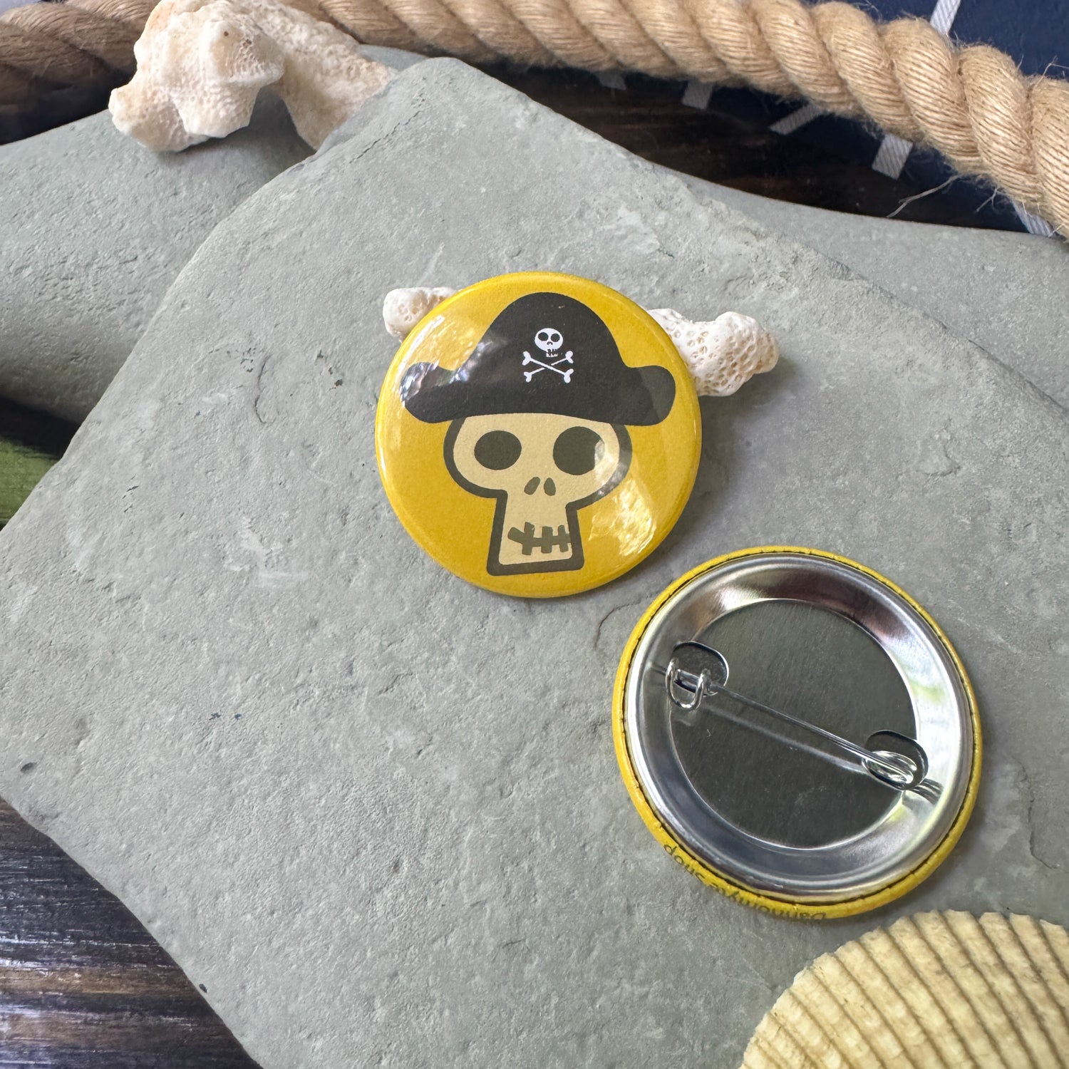 Arrrr, matey! Look no further for a duo of pins to add a touch of piratey flair to your bag, jacket or collection. Featuring one pin of a skull with a pirate hat and another with a laughing skull sticking out its tongue, this duo of skulls have had a sketchy past of blundering booty.